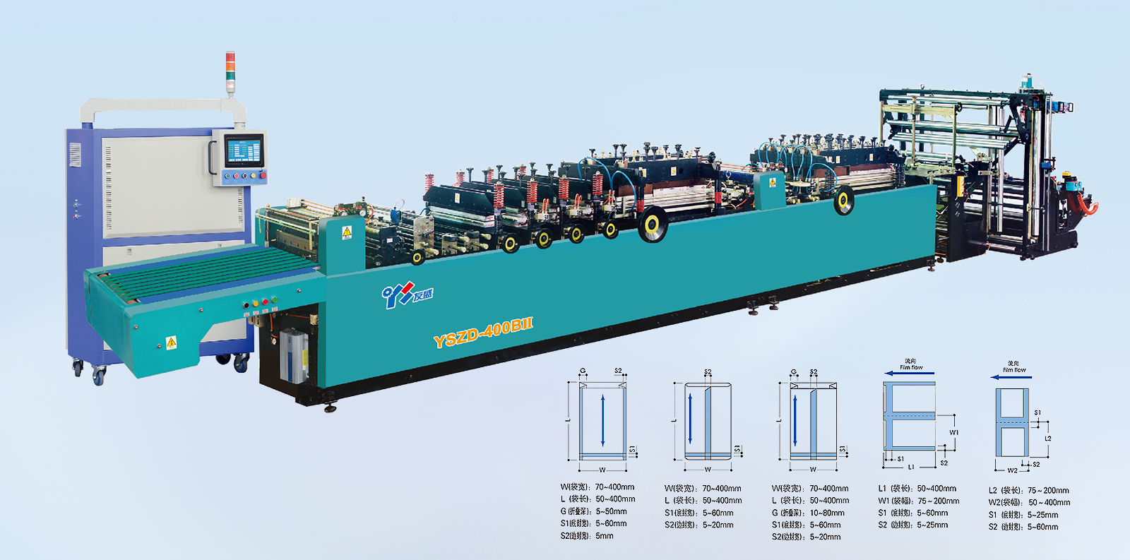 材料:各種復(fù)合薄膜。 卷筒:寬度≤1200mm,直徑≤800mm。 制袋速度:180段/分(機(jī)械設(shè)計(jì)速度)約<40m/min。 制袋寬度:≤500mm。 制袋長(zhǎng)度:50-400mm,制袋長(zhǎng)度超過(guò)400mm 以上應(yīng)采用倍送功能。